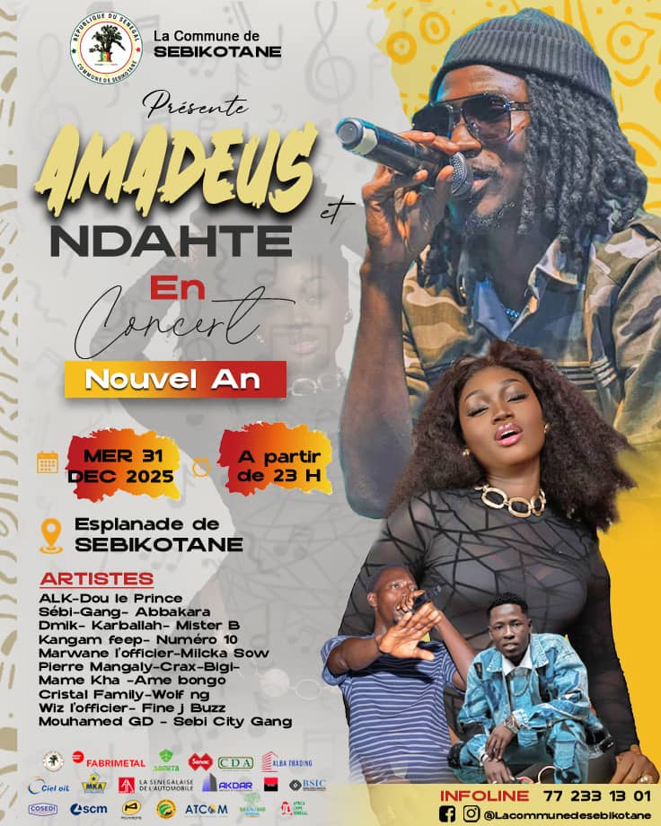 À l'occasion des fêtes de fin d'année, la mairie de Sébikotane offre à la population un concert gratuit avec les artistes Amadeus et Ndakhte Lo. L'événement se déroulera le 31 décembre 2025 à partir de 23h sur l'esplanade de Sébikotane, face à l'usine SOMETA. Tous les Sébikotanois sont conviés à cette soirée festive et conviviale
